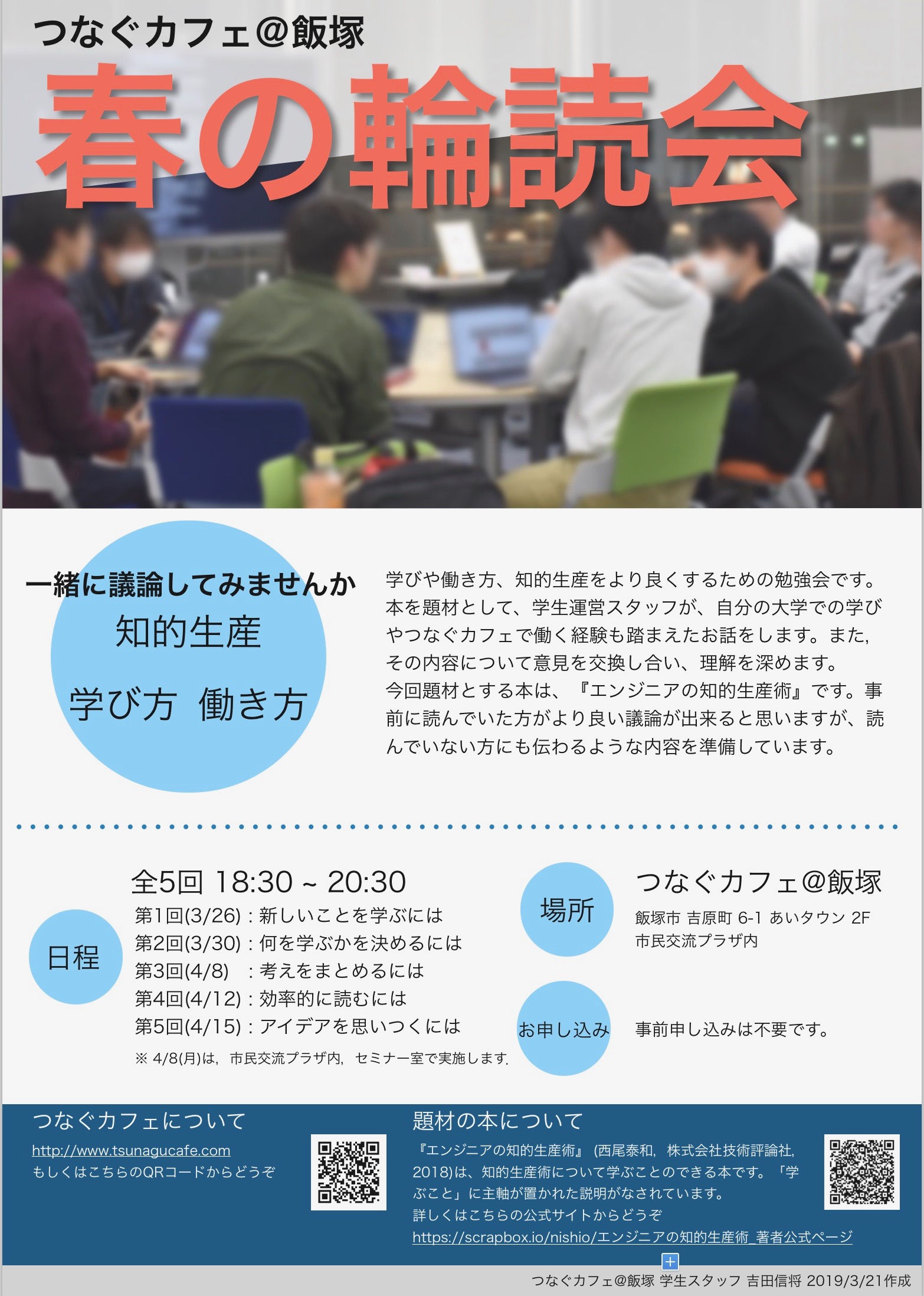 飯塚の企業で働いている方などの一般の方にも来て欲しいので、つなぐのfacebookで流したり、印刷してつなぐ内に貼るために作った。