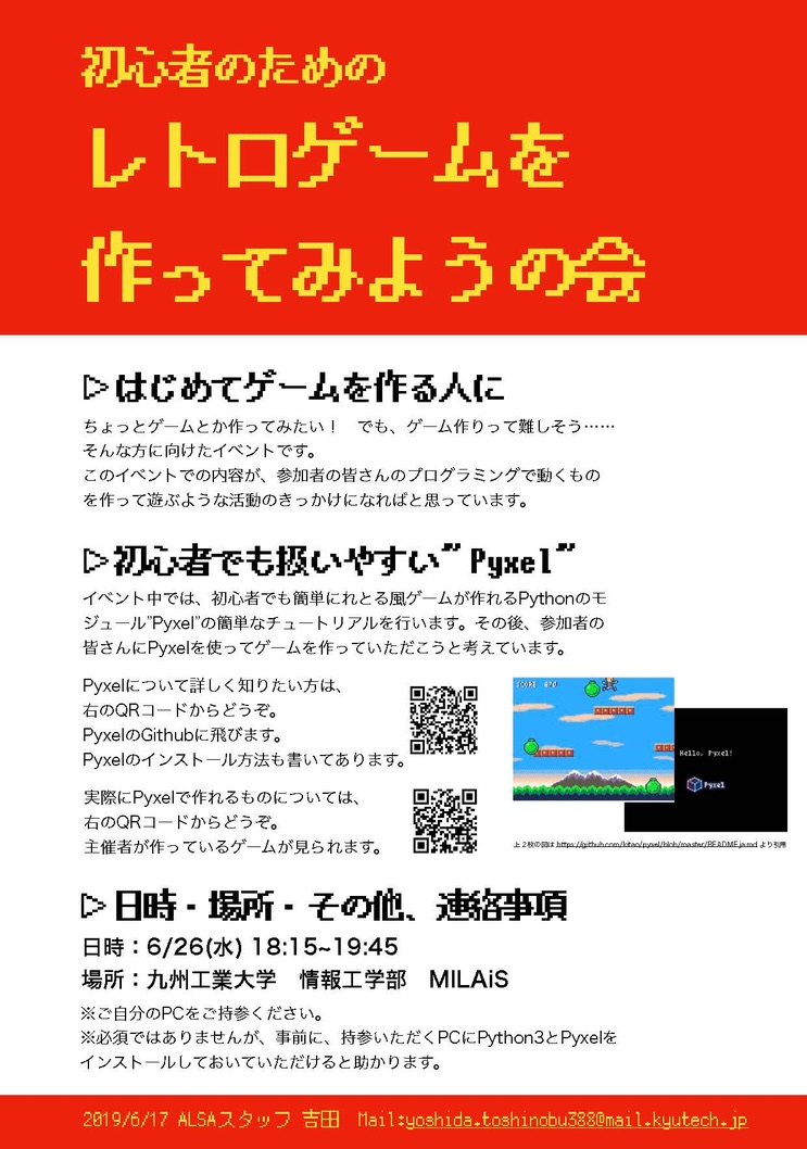 バイト先のALSAでPyxelが面白いといった話をしていると、それの勉強会を吉田が開催することになり、告知用に作った。